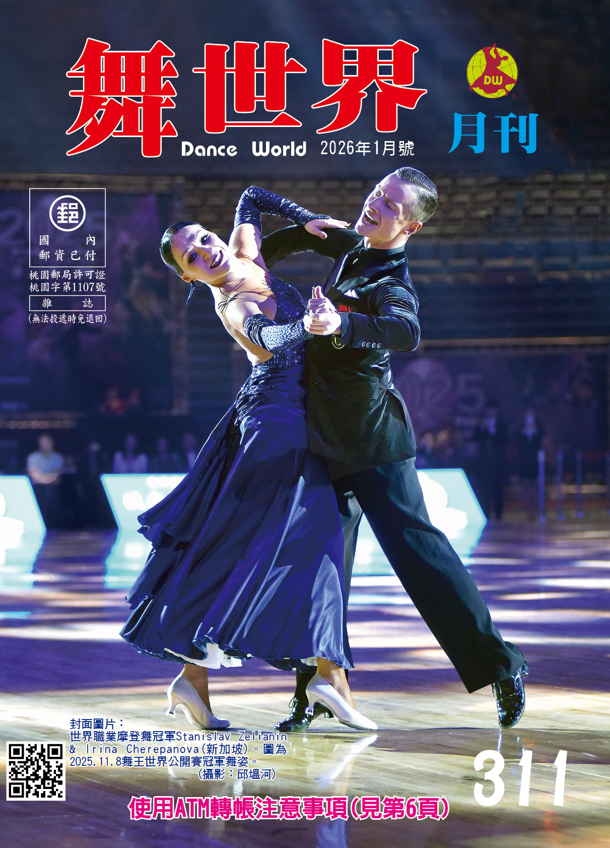 封面圖片:世界職業摩登舞冠軍Stanislav Zelianin & Irina Cherepanova(新加坡)。圖為2025.11.8舞王世界公開賽冠軍舞姿。(攝影:邱塭河)。