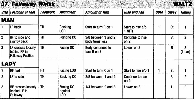 1. 都是在PP位置往後退。Whisk 是男女夾腳在後(Crosses Behind)、Fallaway 則是男女都後退在反身位置上(Back in CBMP)。