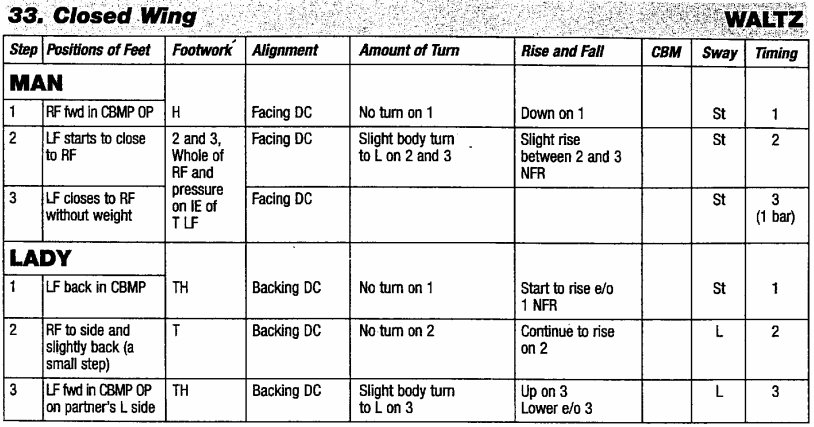 2. Closed Wing可以想成是引導女士從閉式舞姿外側舞伴跳RF Forward Closed Change,但是男士只移動一?而且不升高,引導女士到左側舞伴的側引導身體位置上。基本觀念與技巧和從PP跳的Wing差不多,就只差在開始的握持位置不同(因此男士身體的左轉幅度比較少)。對女士來說和RF Forward Closed Change的不同,除了是從外側舞伴跳進來之外,只有最後一?女士不併腳,而是前進在左側舞伴的CBMP外側舞伴位置上。